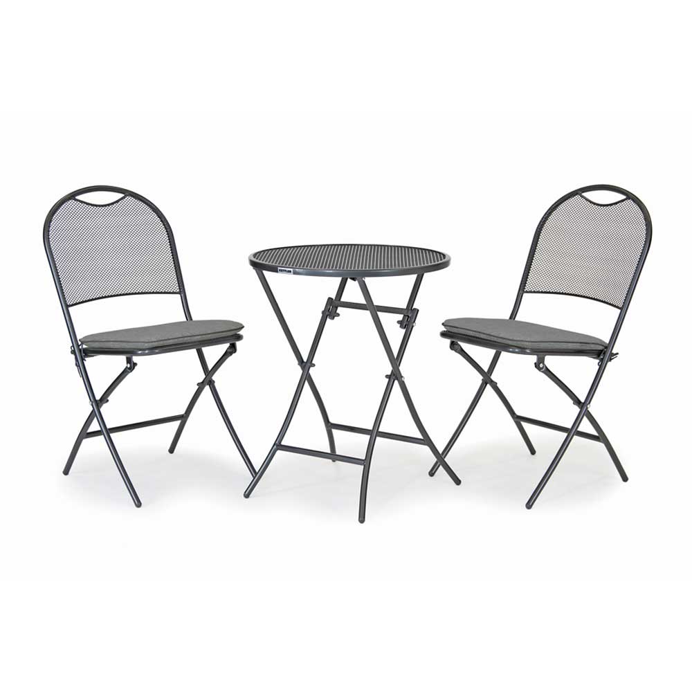 The Cafe Roma sets include 2 mesh chairs and a 60cm mesh table. Perfect for 2 to sit, relax and have a romantic meal on a balcony or quiet corner of your garden. * The thermoguard plus coating is 7 times thicker than paint giving it a tough, all-weather finish and a 3 year anti-rust warranty gives peace of mind. * Can be left outdoors all year round (excluding cushions). * Features: foldable for easy storage, protective foot caps. * Tailored seat pads cushions are available in a choice of colours for added comfort.